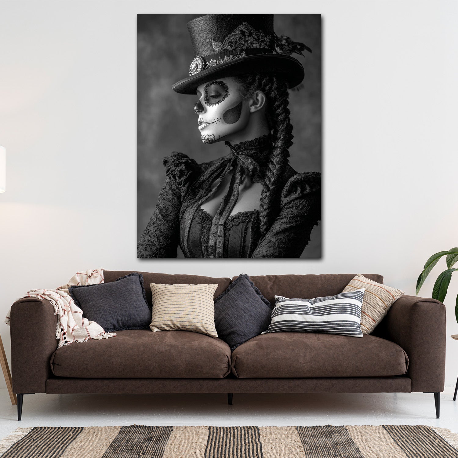 La Catrina ritratto bianco nero con cappello e treccia quadro