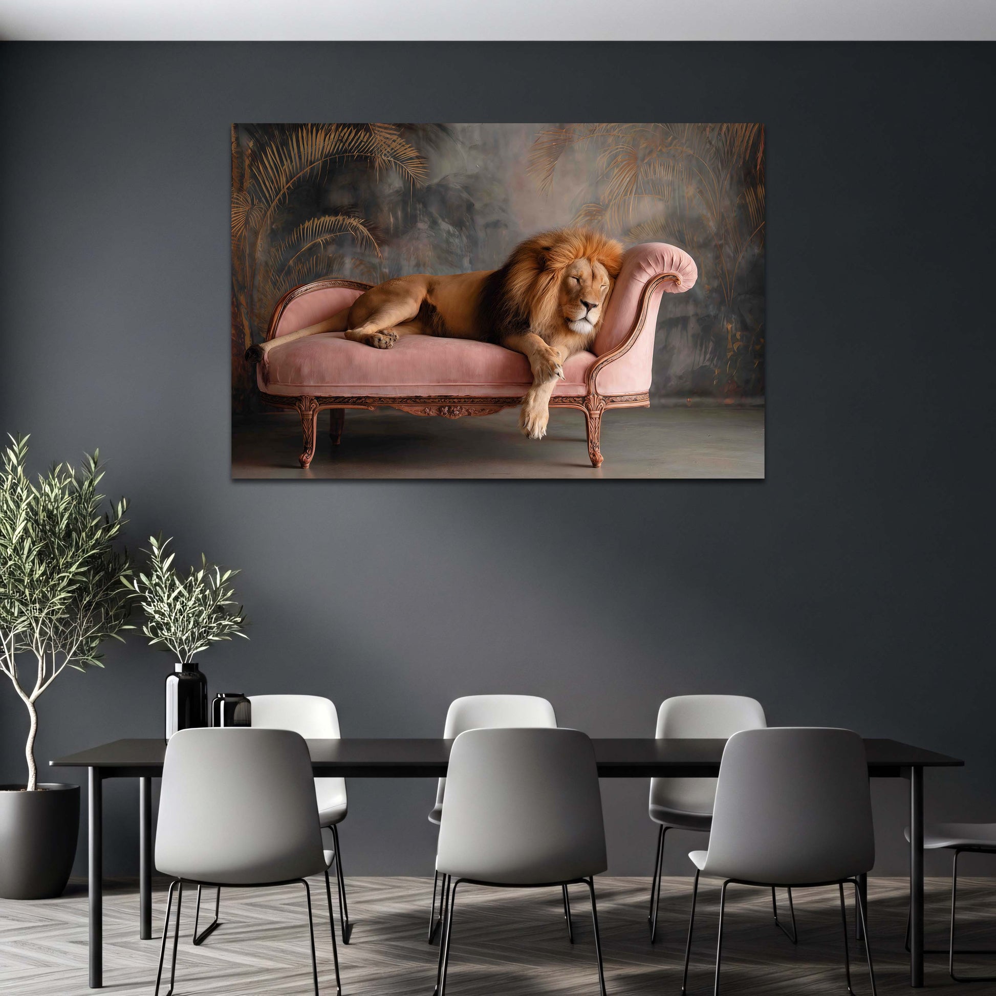 Leone addormentato su divano velluto rosa interno elegante quadro