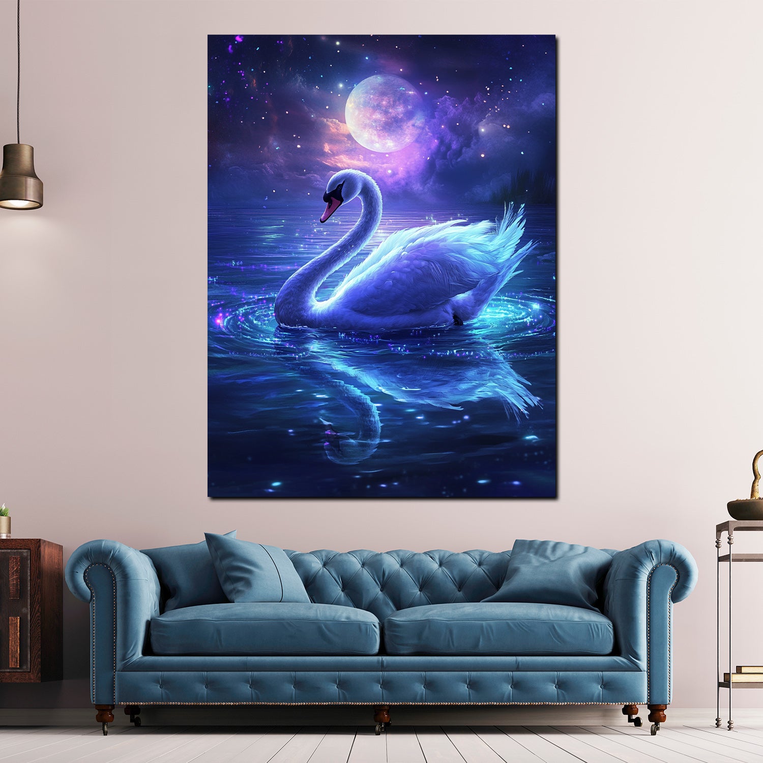 Quadro cigno sognante sotto la luna magia acqua stelle moderno