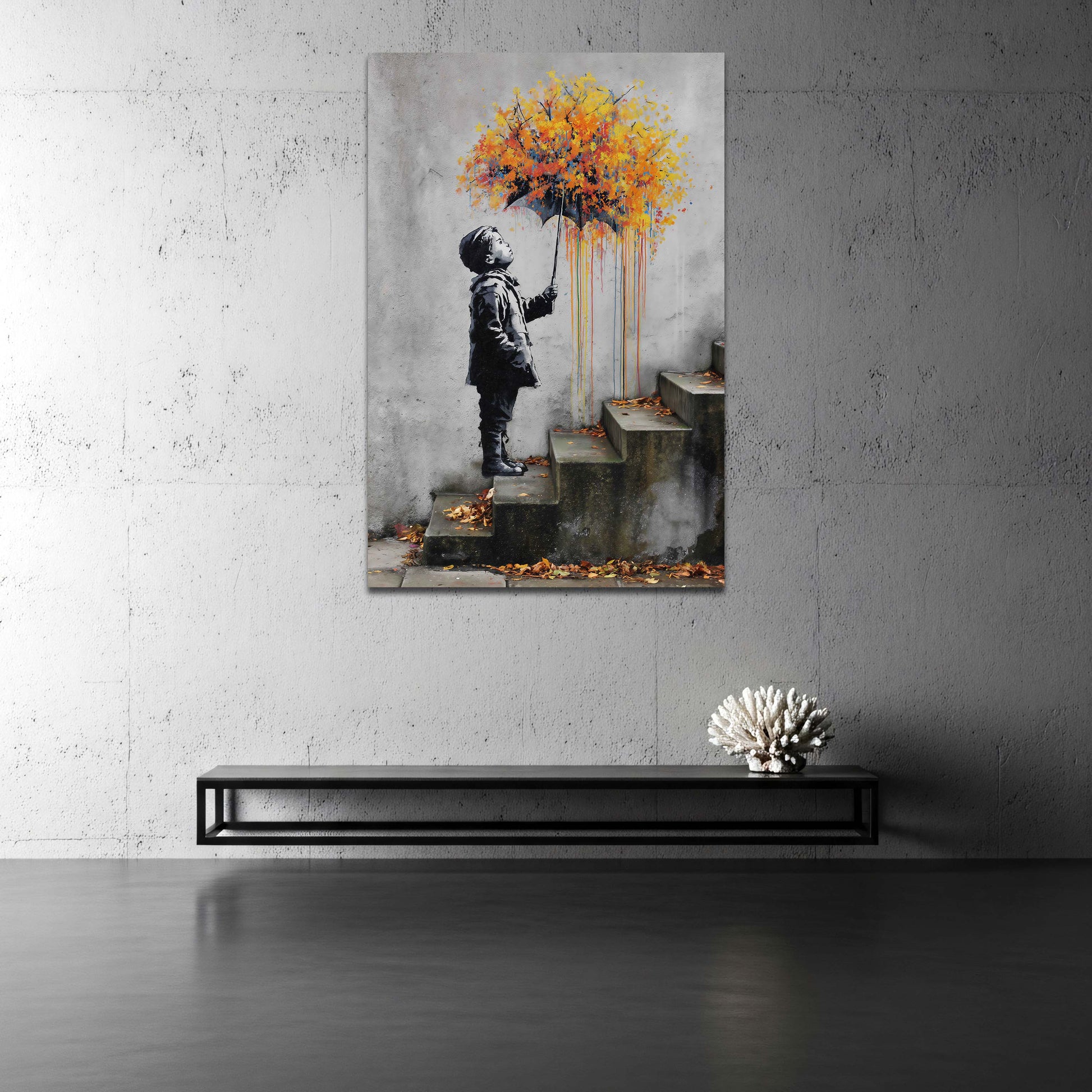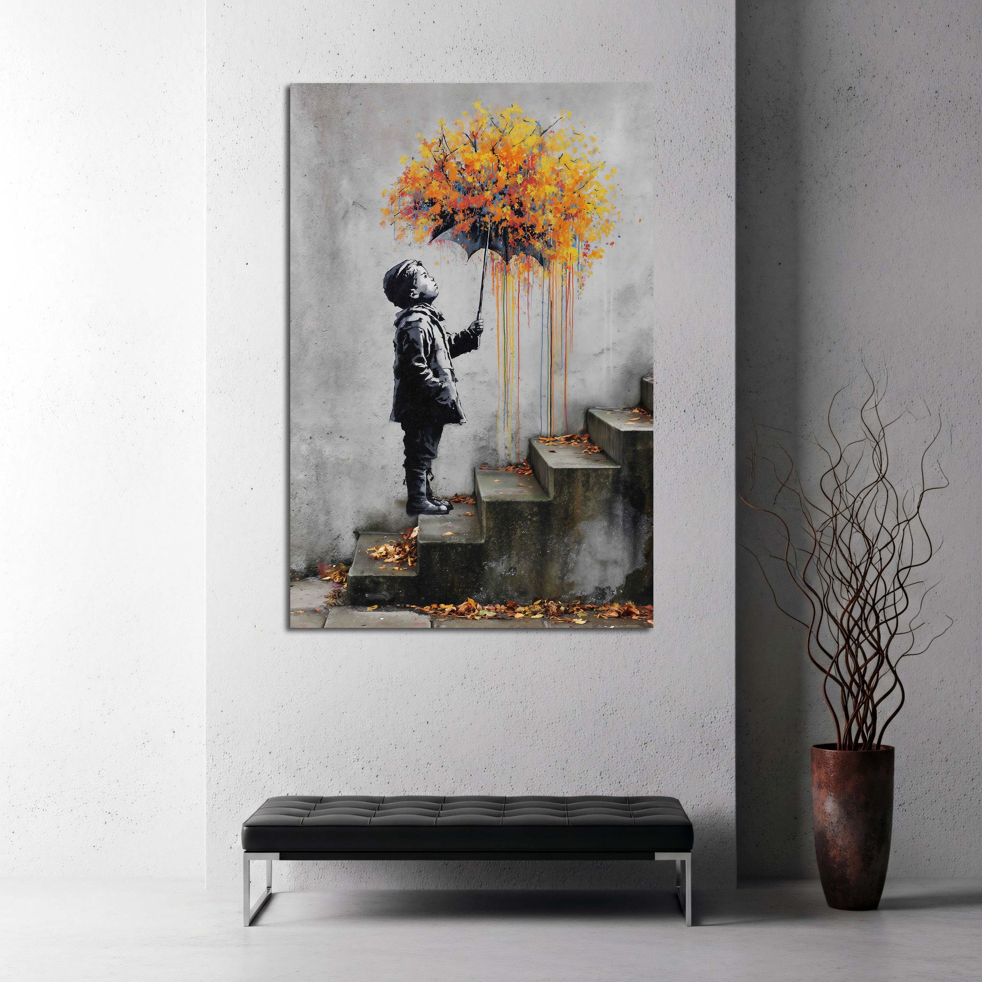 Street art bambino ombrello pioggia di colore quadro